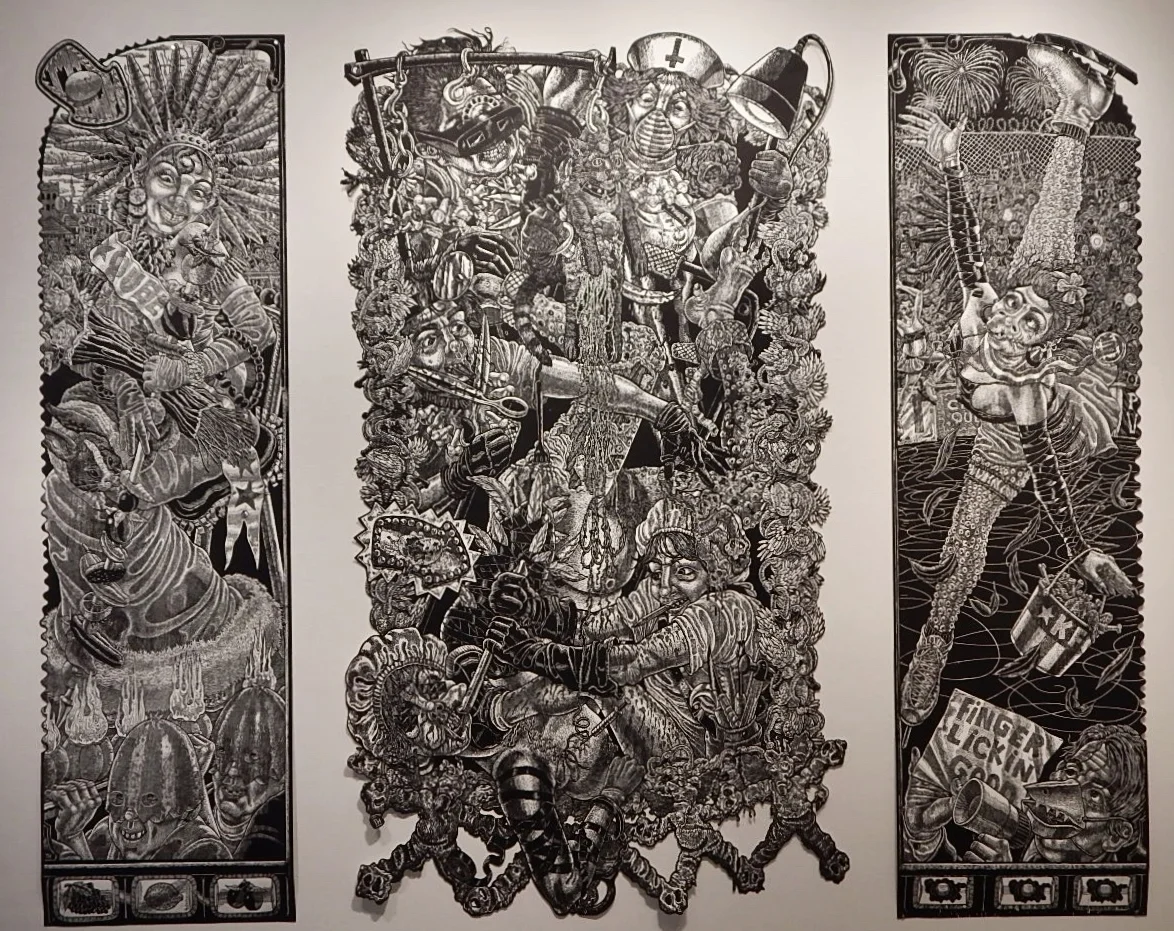 Tom Huck is known for creating satirical, intricate wood prints. His work has been shown in many different museums and art galleries — such as the Whitney Museum of American Art and the Art Institute of Chicago — and featured in The Village Voice and the Minneapolis City Pages. His pieces on display are large graphic prints that are separated into three panels, creating a story. The piece on display is called The Transformation of Brady Baghead, more about the actual piece.