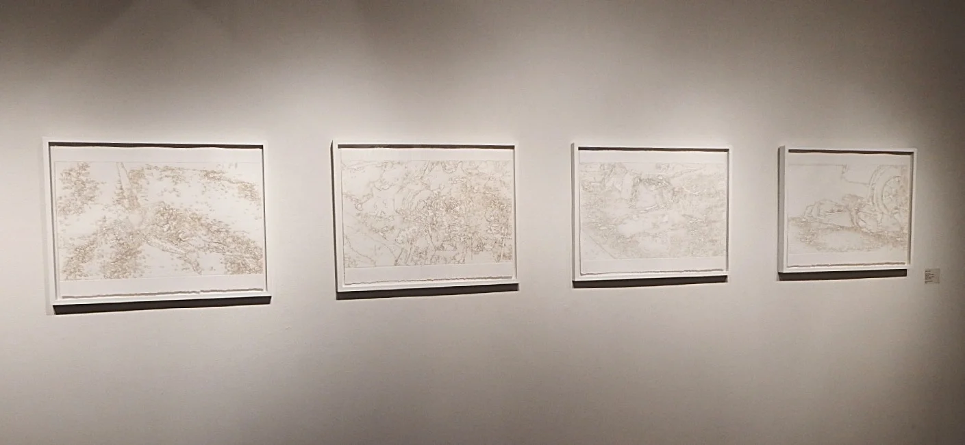 Miguel Aragon’s pieces create an environment like a topographical map, each muted in color. Upon closer look, Aragon forms scenes that can be perceived as islands scattered across an ocean, or mountain ranges forming out of the earth. They tempt the viewer to run their fingers over the ridges to feel the roughness and unevenness of the texture the print creates.