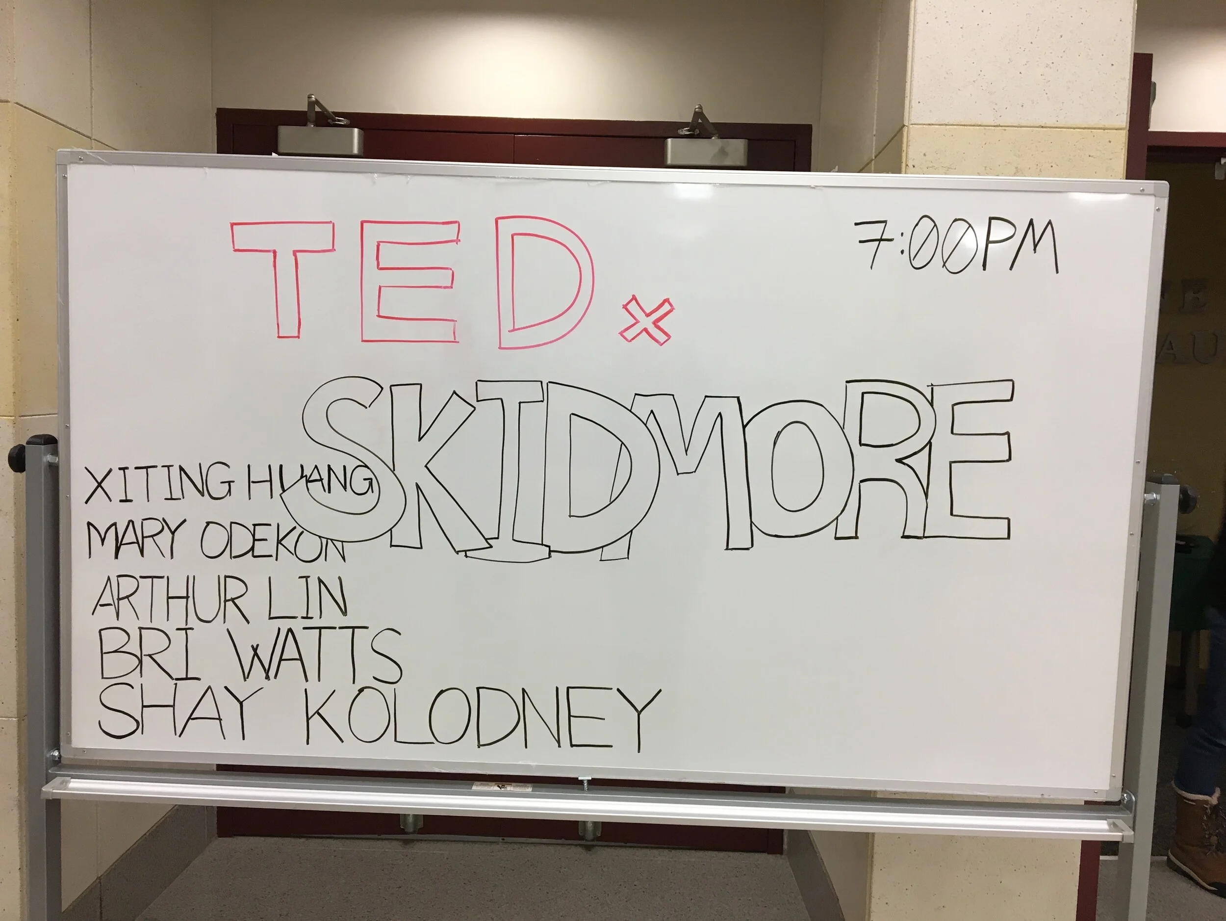 At the bottom of the auditorium stood the blocky red and white letters spelling out “Tedx Skidmore.” Gannett auditorium was about half full when I got there, and it continued to fill as the start time drew closer. Videos were rolling on the projector, previewing the speakers for the night. And in the front row sat Xiting Huang, Professor Mary Odekon, Arthur Lin, Bri Watts, and Shay Kolodney, waiting for their chance to share their truth with Skidmore and the surrounding community.