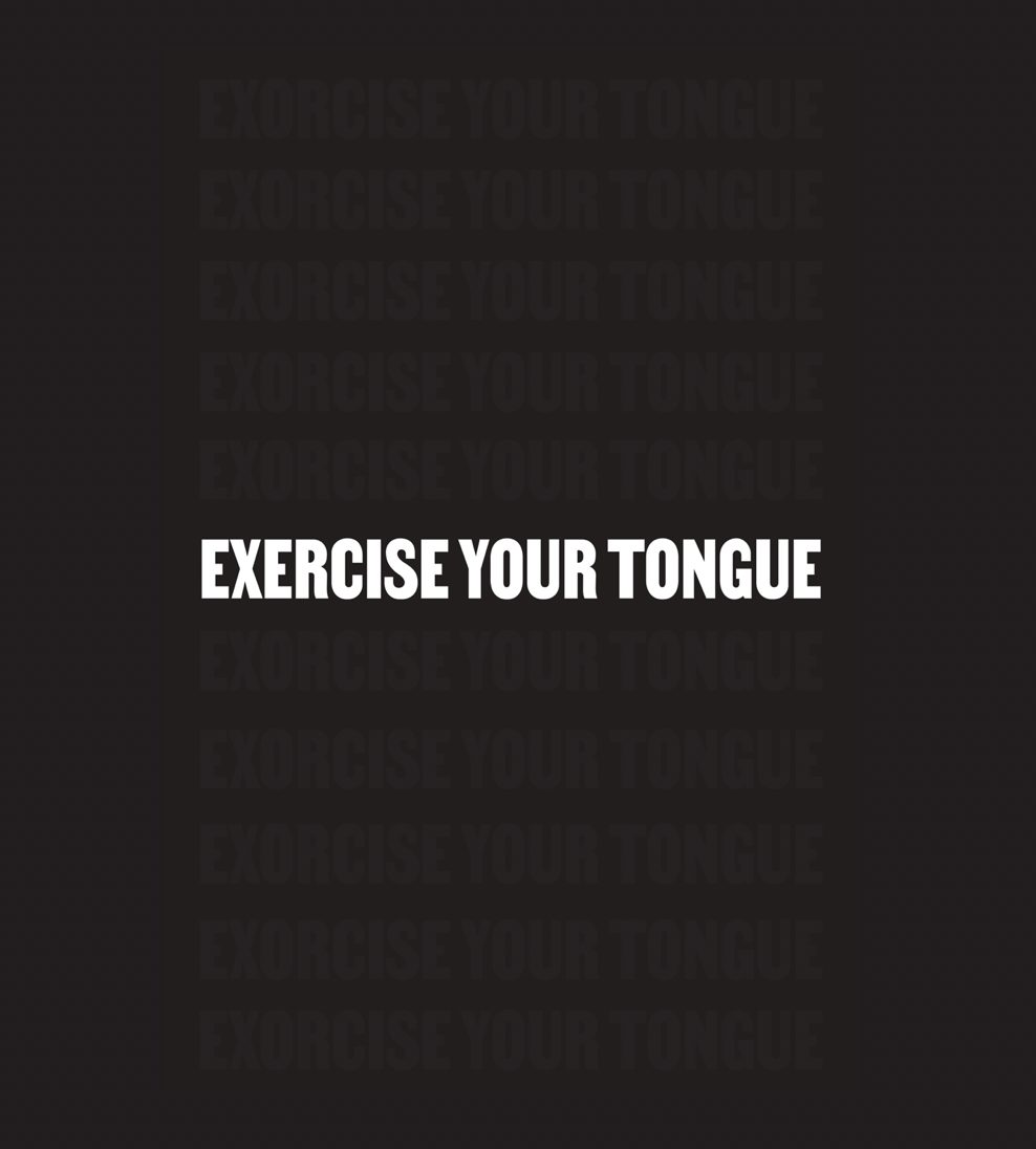 The first print that sets the precedent for the rest of the pieces contains phrases in bold with the message “Exercise Your Tongue,” which is repeated over eleven times. The phrase is spelled “Exorcise” for ten spellings in black lettering over a black background, while “Exercise” is located once in the center in white lettering over the black background.