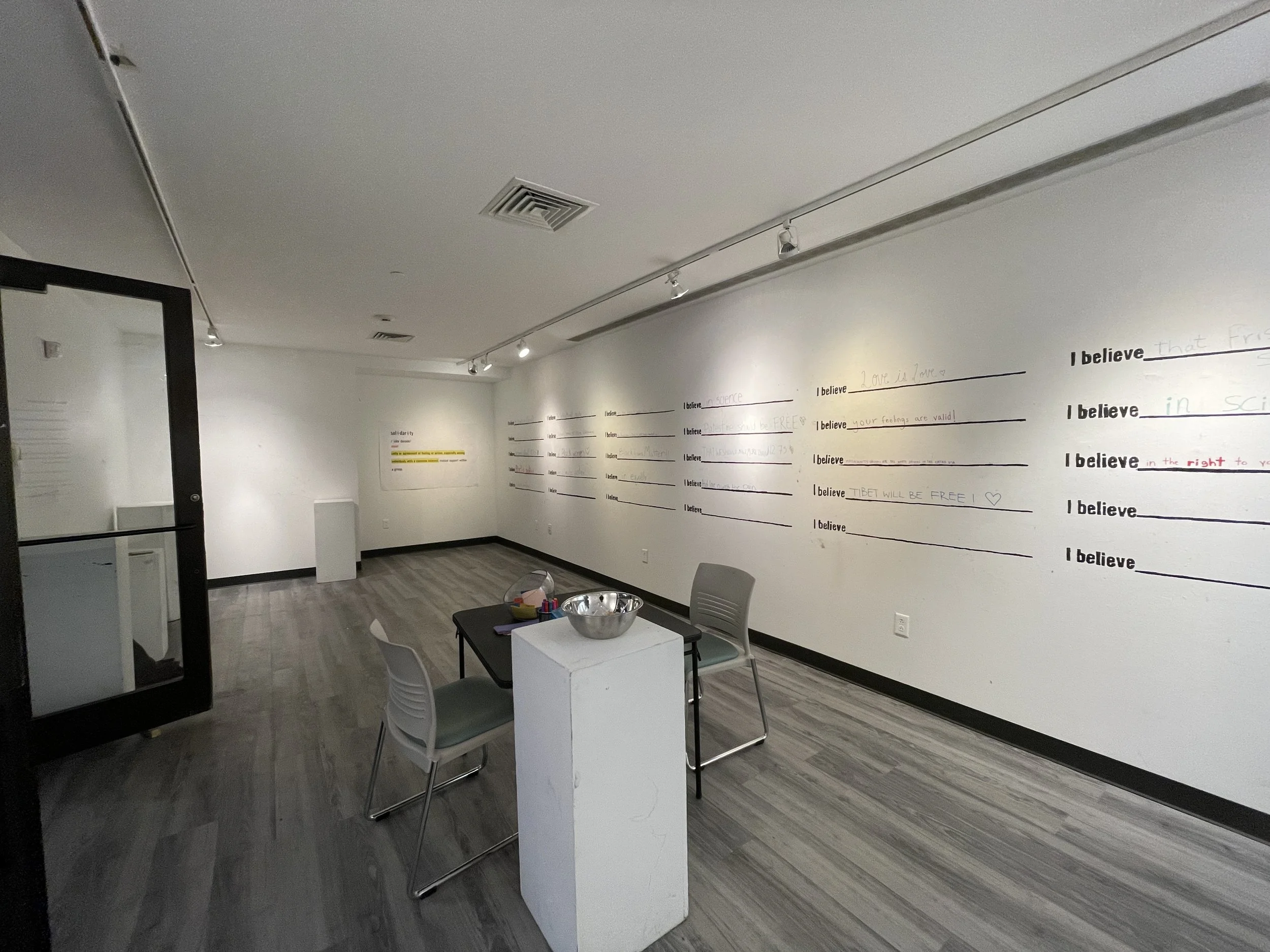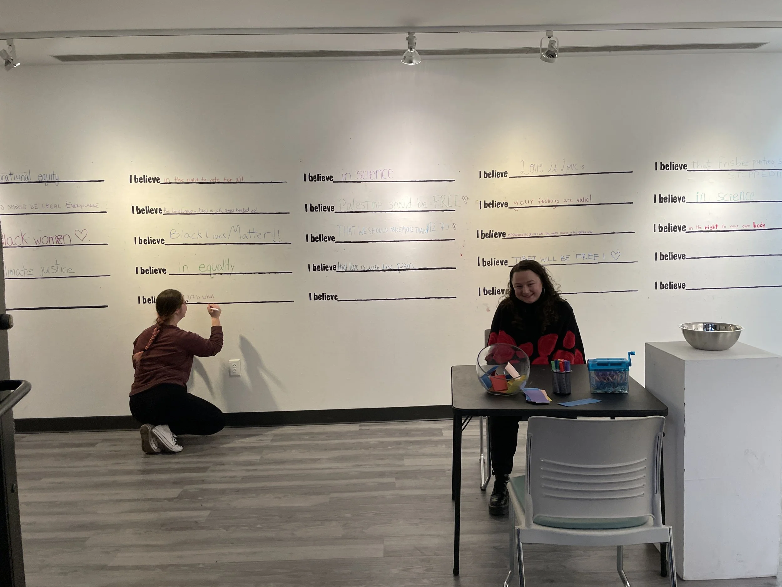 It will work as the following: First, you will write down a sentence about something that you believe on a piece of paper. It can be anything, as long as it does not violate the Skidmore Code of Conduct and is protected under the First Amendment. Then, you will draw someone else’s statement out of a bowl. In order for your own statement to be submitted to the bowl, you must handwrite the statement you drew, word-for-word on the wall. If, for whatever reason, you do not feel comfortable writing someone else’s statement on the wall, then both your statement and their statement will be shredded. No one’s will be on the board for all to read.