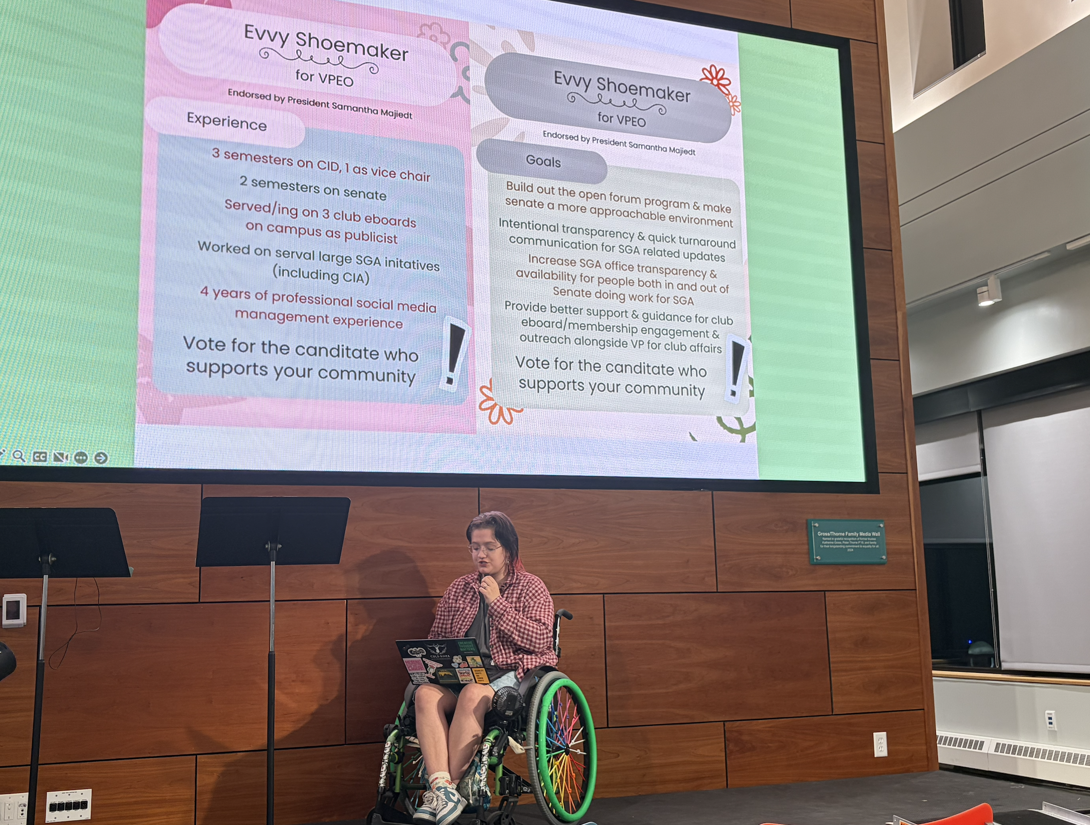 Candidate for VP of Engagement and Outreach, Evvy Shoemaker ‘28. Image courtesy of Sruti Ramaswamy ‘26.