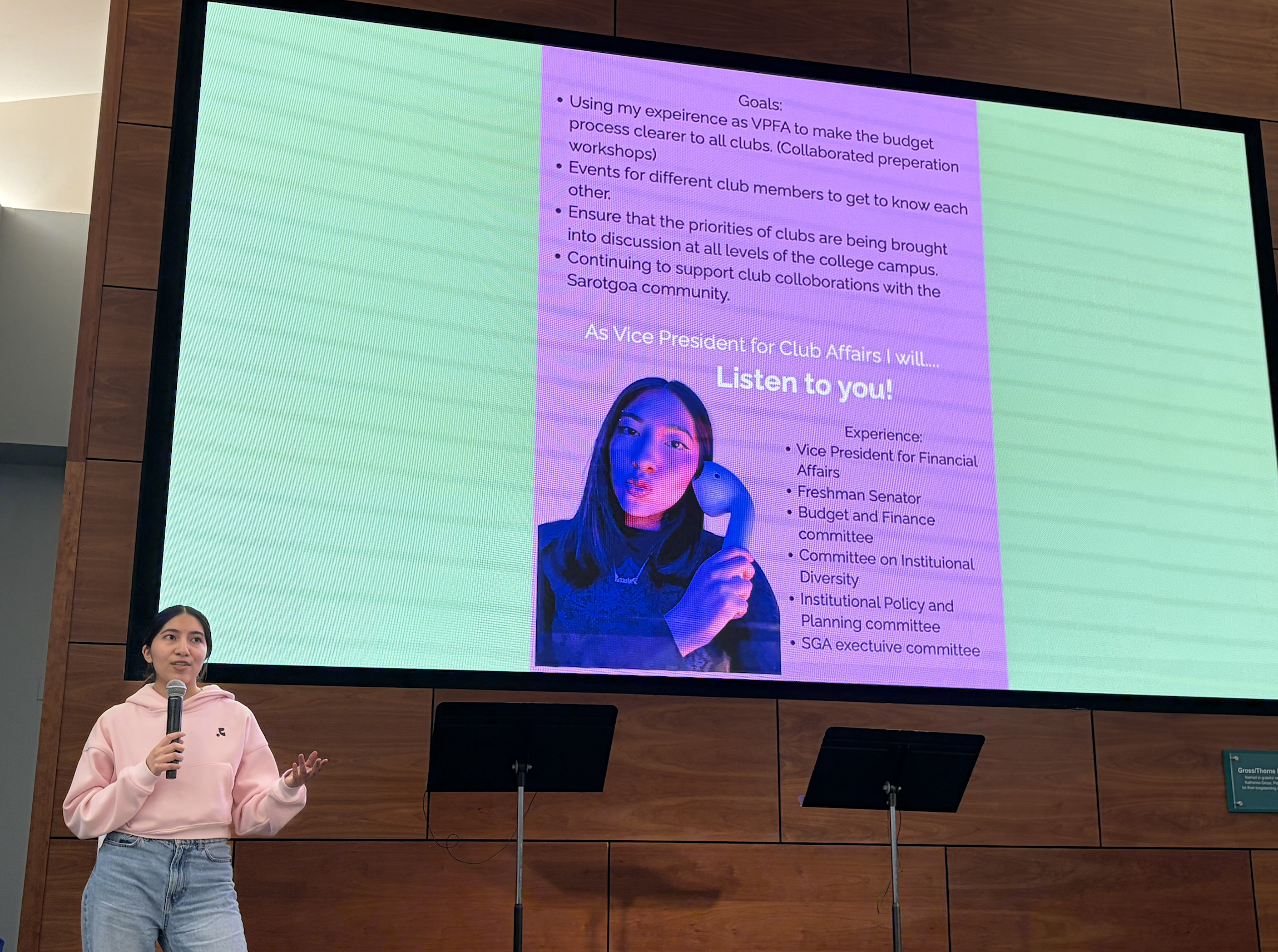 Candidate for VP of Club Affairs, Claudette Castillo ‘28, making her speech. Image courtesy of Sruti Ramaswamy ‘26.