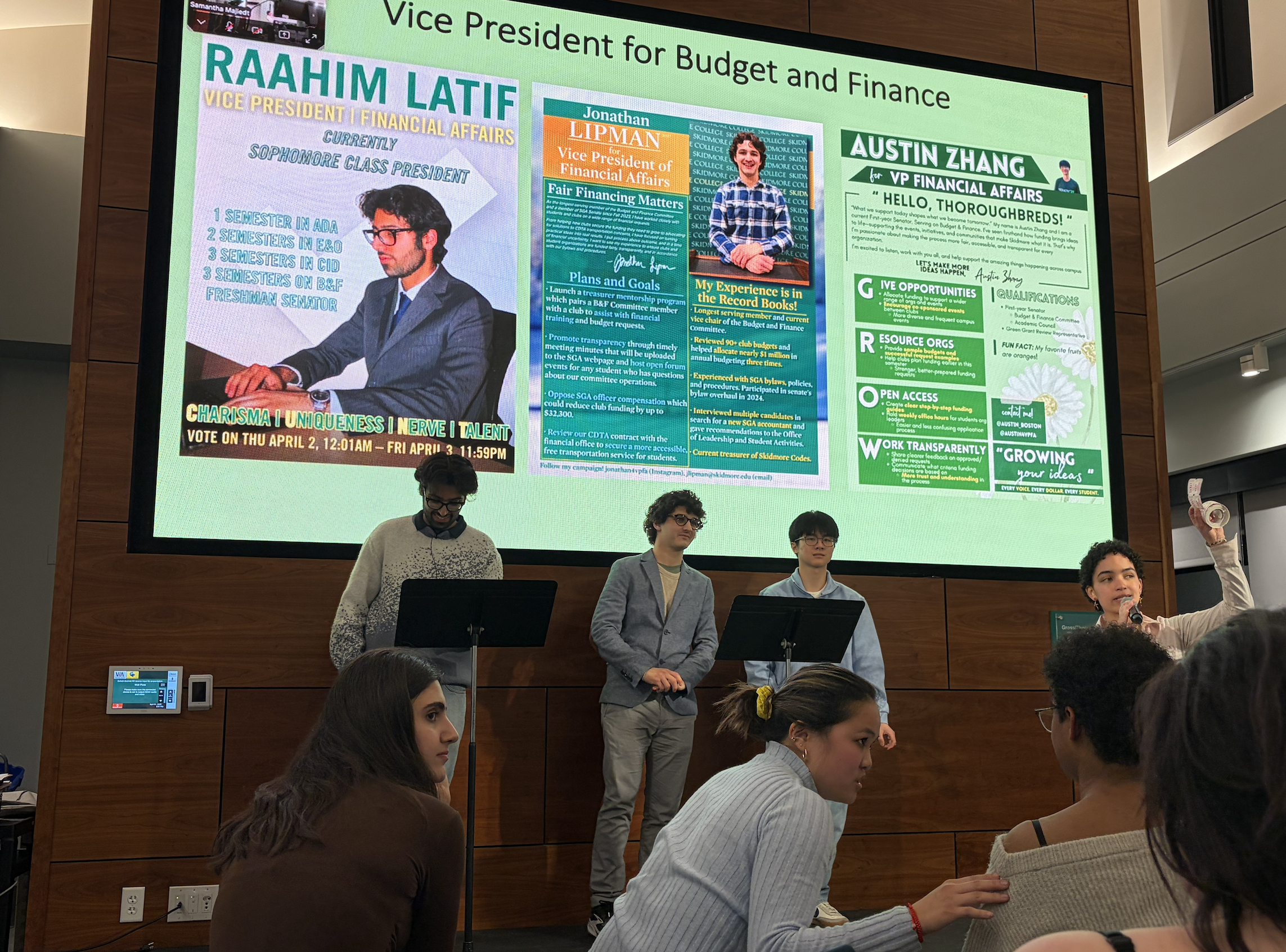 The next debate featured the Vice President for Financial Affairs (VPFA) candidates – Raahim Latif ‘28, Austin Zhang ‘29, and Jonathan Lipman ‘27. Each centered their campaigns on transparency and accessibility in regards to student government funding, although their approaches differed. Latif underscored his experience as Freshman Senator, Sophomore Class President, and on the Budget and Finance Committee, the Committee on Institutional Diversity, and the Subcommittee on ADA. He argued that his familiarity with bylaws and club needs would allow him to effectively support students. Zhang focused on structural reform, saying that he’s seen where the system breaks down and how confusing policies stop requests before they can continue. He added that funding at Skidmore is about navigating systems to bring student ideas to life and positioned himself as a candidate who could do so, suggesting clearer guidelines and standardized feedback to help clubs navigate funding and budget requests. Lipman talked about his experience reviewing over 90 club budgets, thrice helping to allocate nearly $1 million in annual budgeting, and participating in the search committee to hire a new SGA accountant. He proposed initiatives like treasurer mentorship, open budget meetings, and small descriptions of Senate meetings. Attempting to establish himself as a candidate with a fresh perspective, he also pointedly voiced his dislike for Claude AI and his opposition to using it for summarizing Senate sessions.